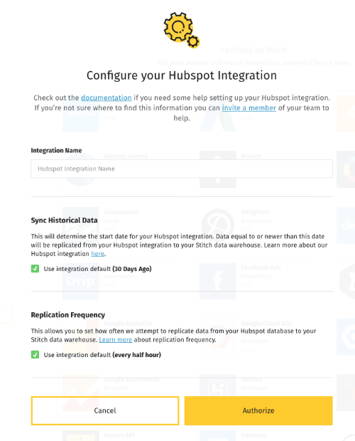 The code below will create a HubSpot integration (type: platform.hubspot) in the user’s Stitch account, with the campaigns and companies tables pre-selected for replication.