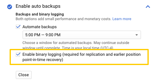 In this step, you’ll enable automated backups and binary logging for the Google CloudSQL MySQL database. This is required to use Log-based Incremental Replication.