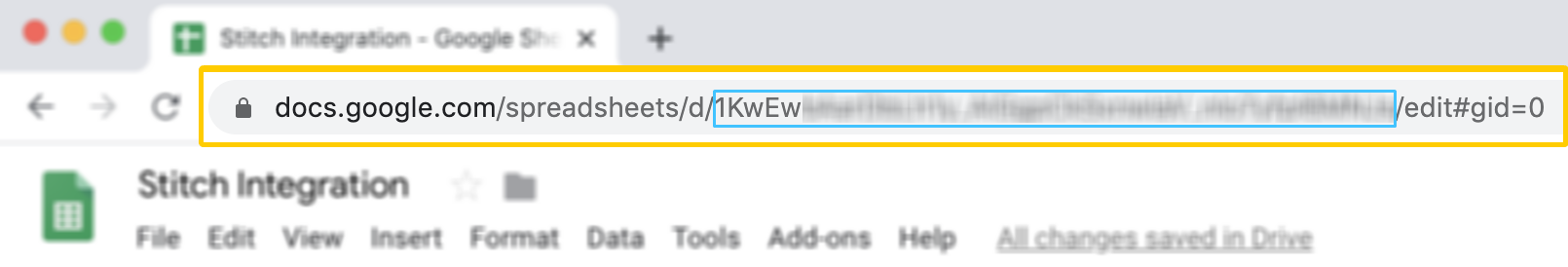 - The Spreadsheet ID is within the URL to the webpage. In the image below, the portion of the URL within the blue box is the Spreadsheet ID. Keep this readily available to continue with the integration.